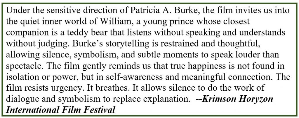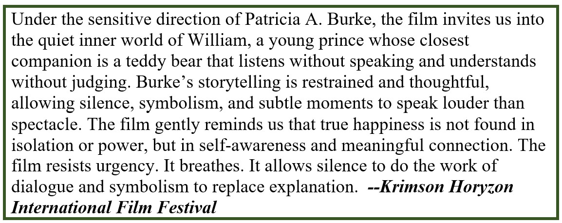 From the award-winning director, Patricia A Burke, comes a captivating parable that explores the journey of a young boy prince and his profound connection to his teddy bear. To find true happiness, William embarks on an inward journey. Guided by a wise shaman, he learns valuable lessons about himself and the world around him. This story delivers a timeless message about the importance of discovering belonging within a community.